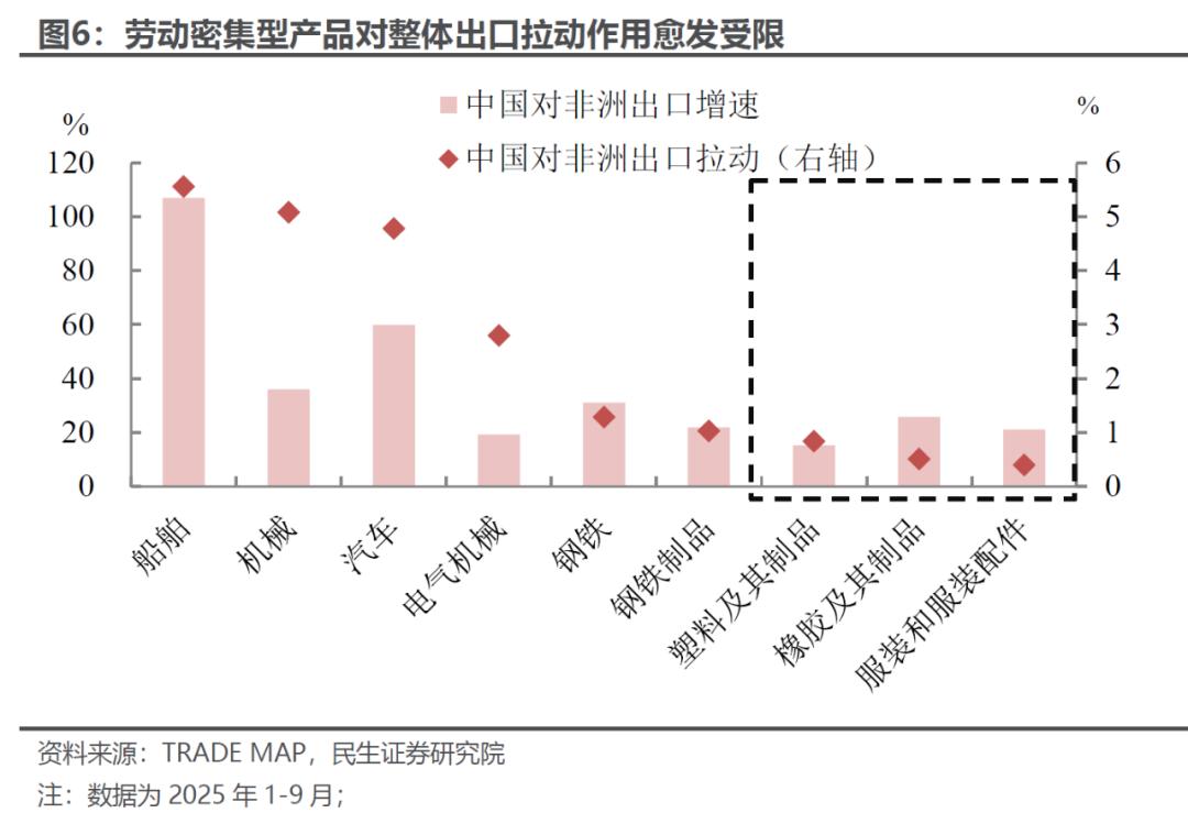而相较机电产品的高增长,劳动密集型产品对整体出口拉动作用愈发有限。塑料橡胶、家具、纺织服装及鞋类等劳动密集型产品虽仍有一定份额,但因中国低端产业转移、本地产业保护及东盟等地区的竞争,在非洲自华进口中占比整体下行、增速放缓,对整体出口增长的拉动作用较弱。