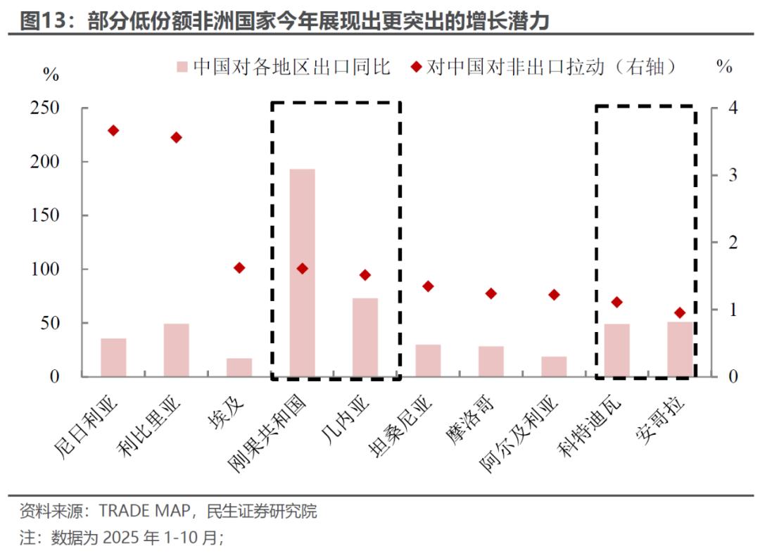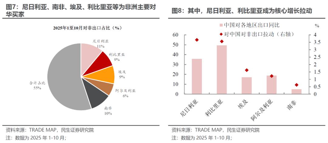 从产品上,基建需求主导下,机电产品占非洲自华进口绝对比重。其中,机械设备、电气机械、汽车、船舶、钢铁及其制品等五类基建相关产品,占非洲自华进口机电产品的绝对比重(合计约55%),贡献了今年以来对非出口增速的75%,成为拉动出口的核心引擎。