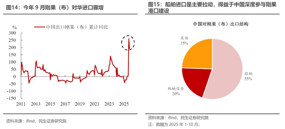 其中,刚果(布)的潜在变化尤其值得关注,在船舶进口的大增下,1-10月刚果(布)对华进口大增至193%,9月单月就贡献了非洲当月对华近三分之一的进口增速。主要原因在于,一方面中国深度参与刚果(布)港口基础设施建设,包括黑角港东部码头扩建等正稳步推进;另一方面,今年9月中刚两国高层会面,将双边关系定位提升为中刚高水平命运共同体,预计将在基础设施等领域展开更积极的合作。