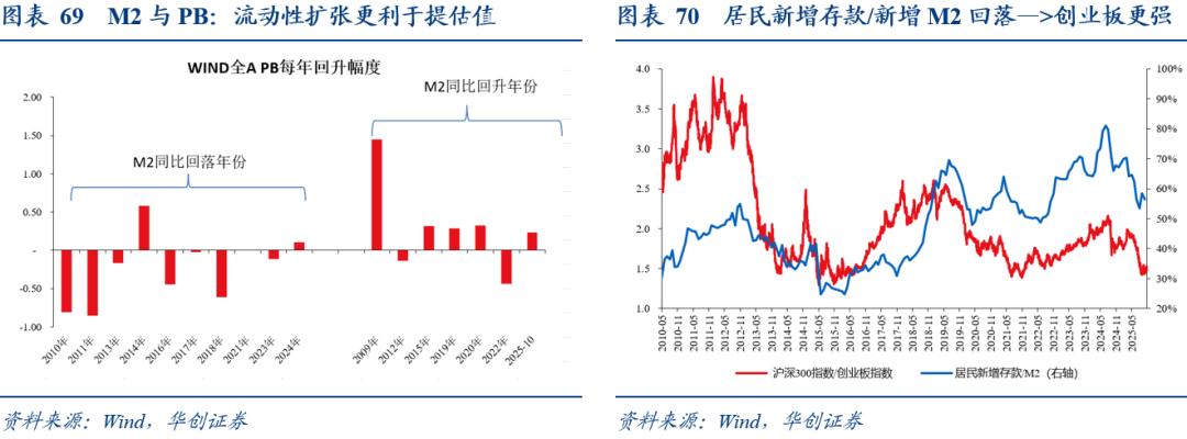 6、其次,讨论M2总量变化对股市的影响,一是从估值角度,2025年估值回升,符合经验规律,历史来看M2同比回升年份,估值回升胜率更高,M2同比回落的年份,估值回升胜率较低。考虑到2026年M2大概率同比回落,估值提升逻辑明年可能会弱化。二是从风格角度,得益于M2的扩张以及居民存款活化,2025年居民新增存款与新增M2比值回落幅度较大,带动的是创业板大幅跑赢沪深300。2026年,若M2增量持平,居民新增存款与新增M2比值或趋于震荡,创业板跑赢沪深300这个风格特征2026年或也将弱化。以上两个弱化,指向的是,2026年股市或应更重视安全边际与盈利改善,更重视经济基本面,具体“切换”的触发点,目前尚难提前预判。