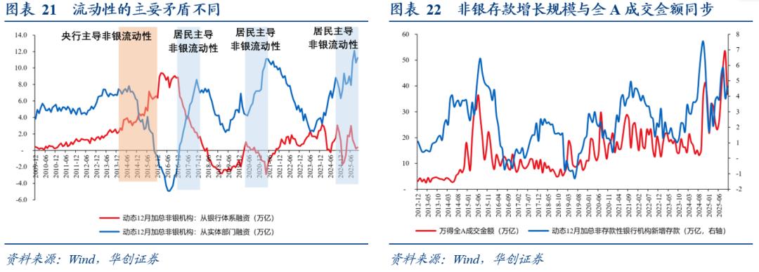 2)第二个结构是:关注非银与居民存款增速差(或居民新增存款与可支配收入比值),其回升(回落)代表居民风险偏好的变化。如果非银存款增速较居民存款抬升,意味着居民在资产配置上将存款转化为金融资产,对应其风险偏好有所抬升;历史经验来看,非银居民存款剪刀差同步于A股成交金额占A股总市值的比重,且非银存款增长规模与A股的成交金额基本保持走势一致。我们目前的判断是,2026年居民或继续存款搬家,但变化幅度上,非银从实体部门融资规模或难以维持2025年35%的增速(注:2025年非银机构从实体融资数据来看,已达到历史极高位置)。对应A股成交额或大体维持2025年水平,进一步再上一个台阶可能有困难。