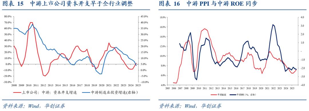 1)为何关注中游?主要是今年中游出现了四个积极的变化。一是盈利能力开始修复,ROE率先回升。二是“反内卷”更聚焦中游,或继续约束供给,从目前的中游投资与中游需求对比来看,中游率先出现投资增速低于需求增速。三是海外收入占比以及盈利占比上升,受外需影响更大,与上游或下游相比,景气独立性或更强。四是率先受益科技革命,在海外AI资本开支继续增加,国内强调科技自立自强背景下,预计同样会加大投入,中游受益(可能途径是企业设备购置投资增加或政府采购增加)。