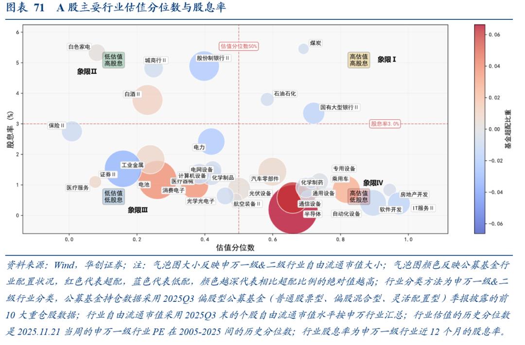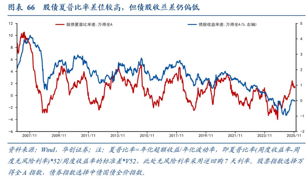 第二,波动率将影响股债配置价值的考量。以夏普比率差衡量股债配置价值差异,以债股收益差(10年国债利率与全A股息率差值)衡量两者估值差异。两者若出现背离,则可能有一方的估值相对于其配置价值太高或太低。截至2025年11月21日,股债夏普比率差为1.34,仍处于历史相对高位(十年72%分位数),但债股收益差为-0.03%,仍处于历史低位(十年11.9%分位数)。我们看好股市波动率在“十五五”期间中枢回落,则大概率债股收益差将向股债夏普比差靠拢,即,当前,债相对于股依然偏贵,更看好股市的配置价值。