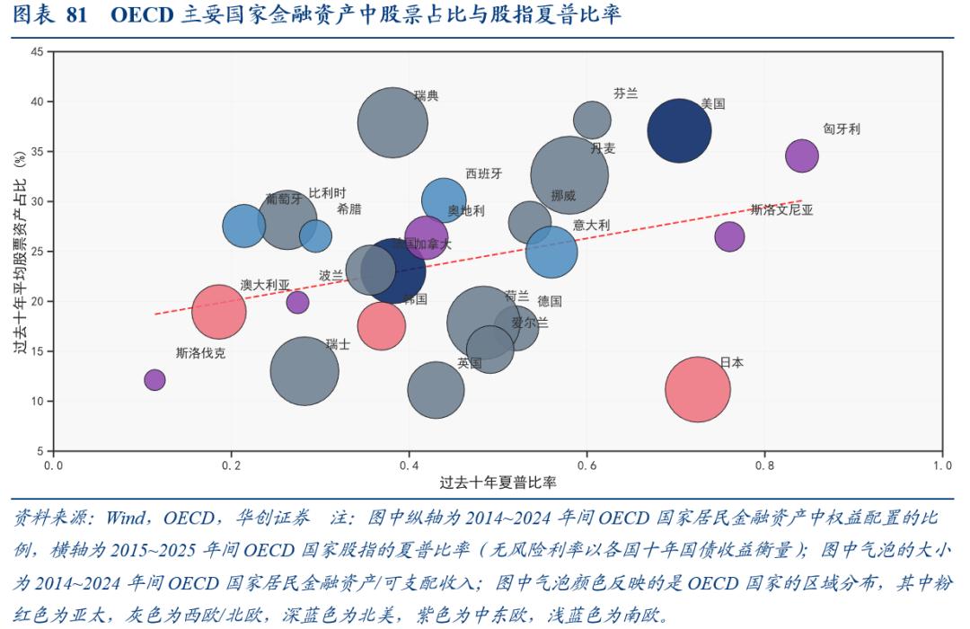 对于股,海外经验(OECD国家)显示,0.1个单位的夏普比(比如1到1.1)的变化,带来股票占居民金融资产之比提升1.56个百分点。中国上证综指过去十年夏普比为0.17(相比海外平均水平偏低),根据央行2019年的调查,居民金融资产中股票比例为6.4%,这意味着若后续上证综指夏普比持续提升,居民部门或可能更多配置股票。