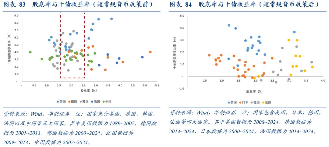 对于债,在各国开启非常规的货币政策之前(对应政策利率降至0%之前),4%-5%的名义GDP增速大致对应十年期国债收益率在2%-5%之间。1.5%-2.5%的股息率大致对应十年期国债收益率在2%-5%之间。截至2025年9月30日,十年期国债收益率约为1.86%。万德全A股息率约为1.81%,沪深300的股息率约为2.56%。即,与名义GDP、股息率相比,当前十年国债收益率已略偏低。