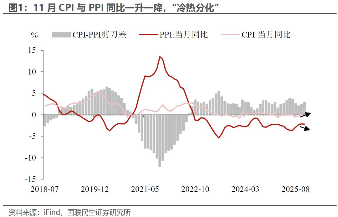 11月通胀数据中,CPI的“升”与PPI的“降”似乎形成了鲜明对比。一升一降的背后,构成了当前宏观态势的鲜明剪影——不仅是年末政策在“提振内需”与“反内卷”之间的权衡与温差;更深层次看,它揭示了当前经济复苏中的结构性矛盾:CPI回升基础并不宽广,更多依赖于季节性食品、金价的价格修复;而PPI的下降或表明“反内卷”政策有待到明年进一步优化加码。具体来看:
