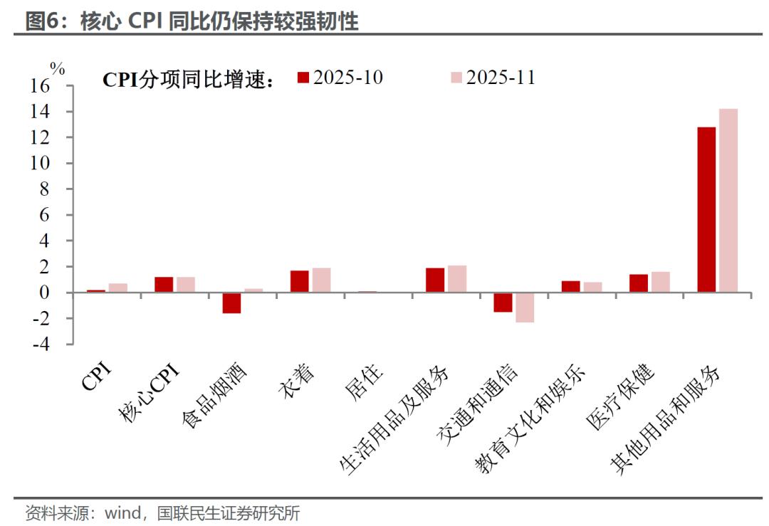 与PPI的不及预期相比,CPI的大幅回升则形成鲜明反差。11月CPI同比增速录得0.7%,较前值0.2%的水平明显回升。不过从驱动因素来看,此次CPI回升更多源于蔬菜等食品类价格的季节性反弹,受前期极端天气及生产流通环节短期扰动影响,部分生鲜农产品供应阶段性收紧,叠加年末需求的上升,带动食品分项通胀快速上行,整体通胀的结构性特征较为突出。