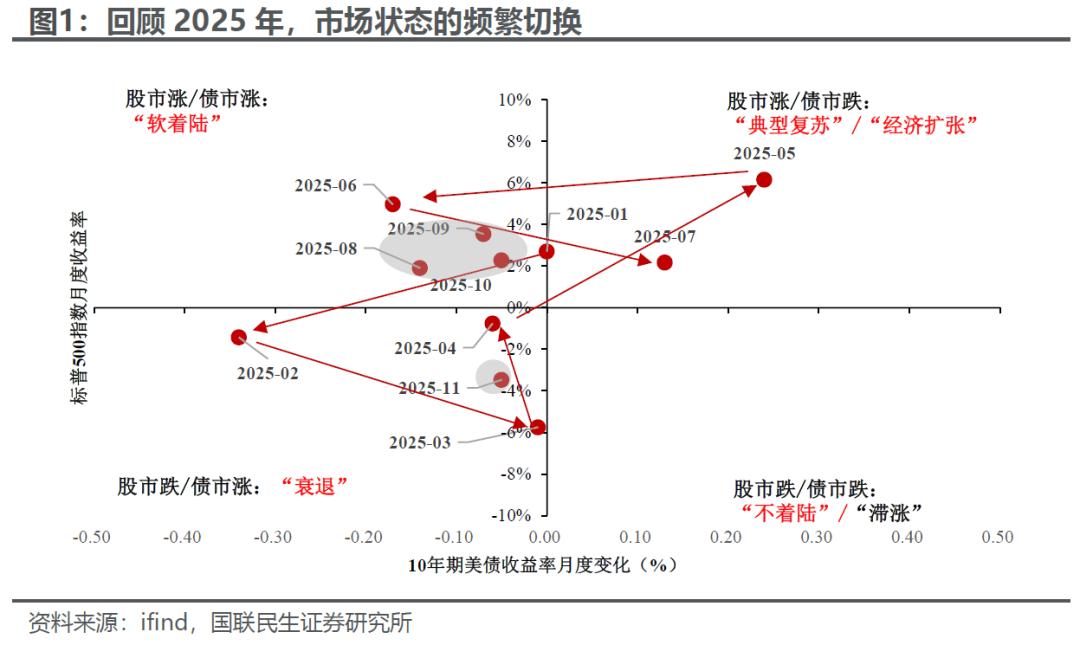 1月,美国“例外论”开始遭受质疑;2-4月,在美国财政紧缩论、关税担忧以及经济数据表现不佳的影响下,市场急转直下、进入类衰退的模式;5-7月,随着“TACO”交易的兴起,且经济数据在关税冲击后反弹,风险资产显著回暖;8-10月,就业市场偏软以及货币政策宽松的影响下,软着陆逐步成为共识;11月,联储有所转鹰以及AI逻辑被市场质疑,美股再度调整,市场一度跌出了衰退/恐慌的感觉。