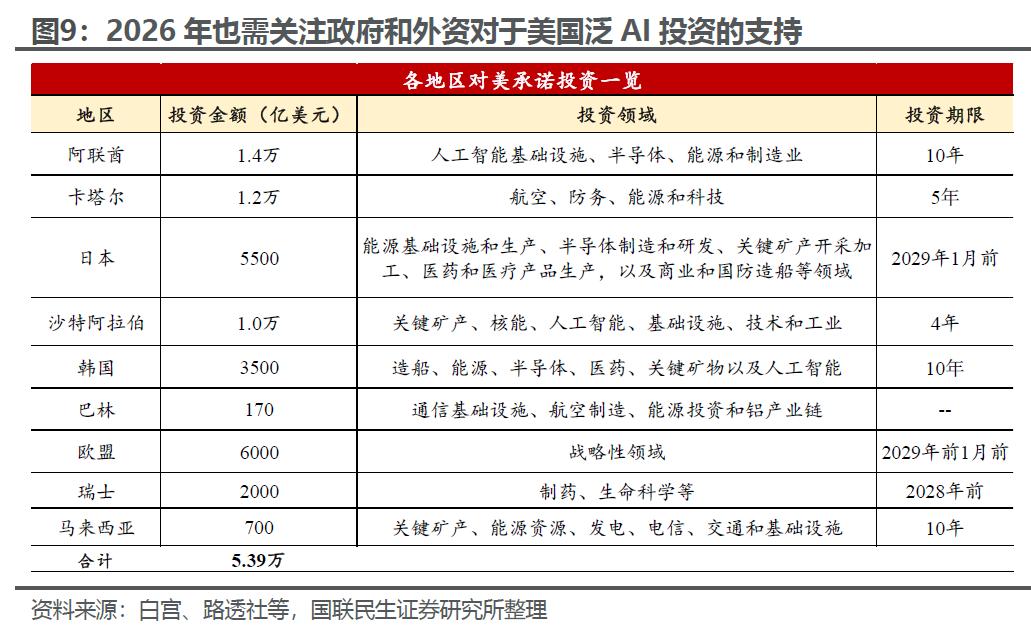 除此之外,过去1年特朗普在全球范围内大力“招商引资”。根据我们的不完全统计,主要经济体承诺对美投资的体量超过5万亿美元,落地期限在4至10年。如果能兑现,年均超过5000亿的投资可以给予GDP体量不到30万亿的美国超过1个百分点的拉动,也十分可观。