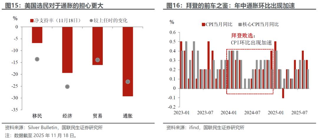 “民生”VS “通胀”:若更加激进地增加居民获得感、或者推进宽松,三季度有可能出现通胀环比回升。我们认为,明年上半年有税收返还的额外“红包”,特朗普如果要给居民“发钱”,最好的时间窗口其实在二季度末至第三季度。另外如果新主席上任后,在6月新官上任三把火,先行激进降息50bp,这些既能成为特朗普拉票的“噱头”,但也会导致通胀环比加速,因此紧跟民意动向、找到平衡很重要。